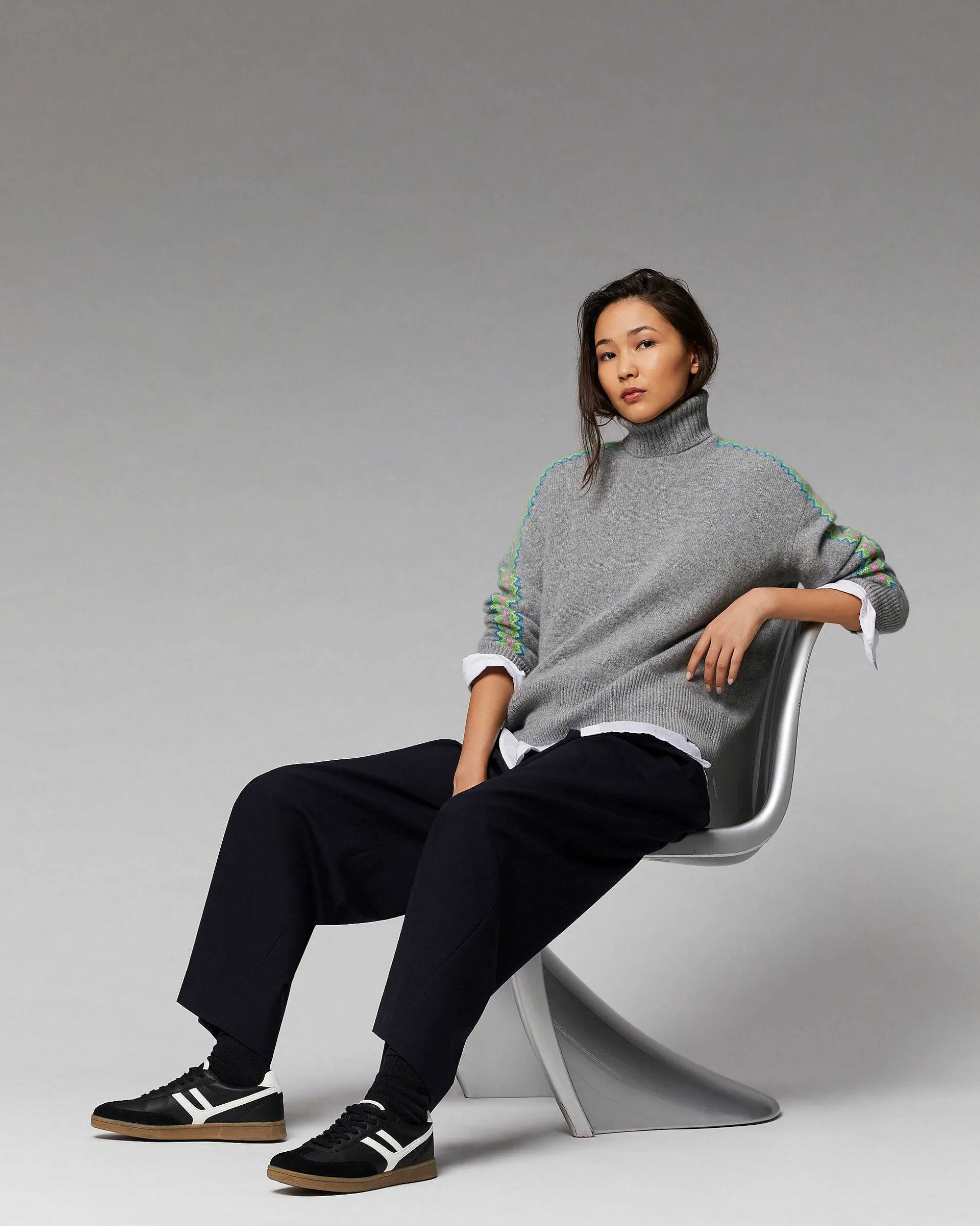 Réhaussez Votre Allure Vers De Nouveaux Horizons Cosmiques Avec Ce Pull Oversize Et Confectionné En Cachemire 4 Fils. Muni D’Un Col Roulé Et De Bords Côtelés, Des Bandes Bicolores Se Dévoilent Le Long Des Manches Pour Ponctuer Votre Silhouette Futuriste. Jouez Le Total Look Casual Avec Une Chemise, Un Pantalon Large Et Des Sneakers.
