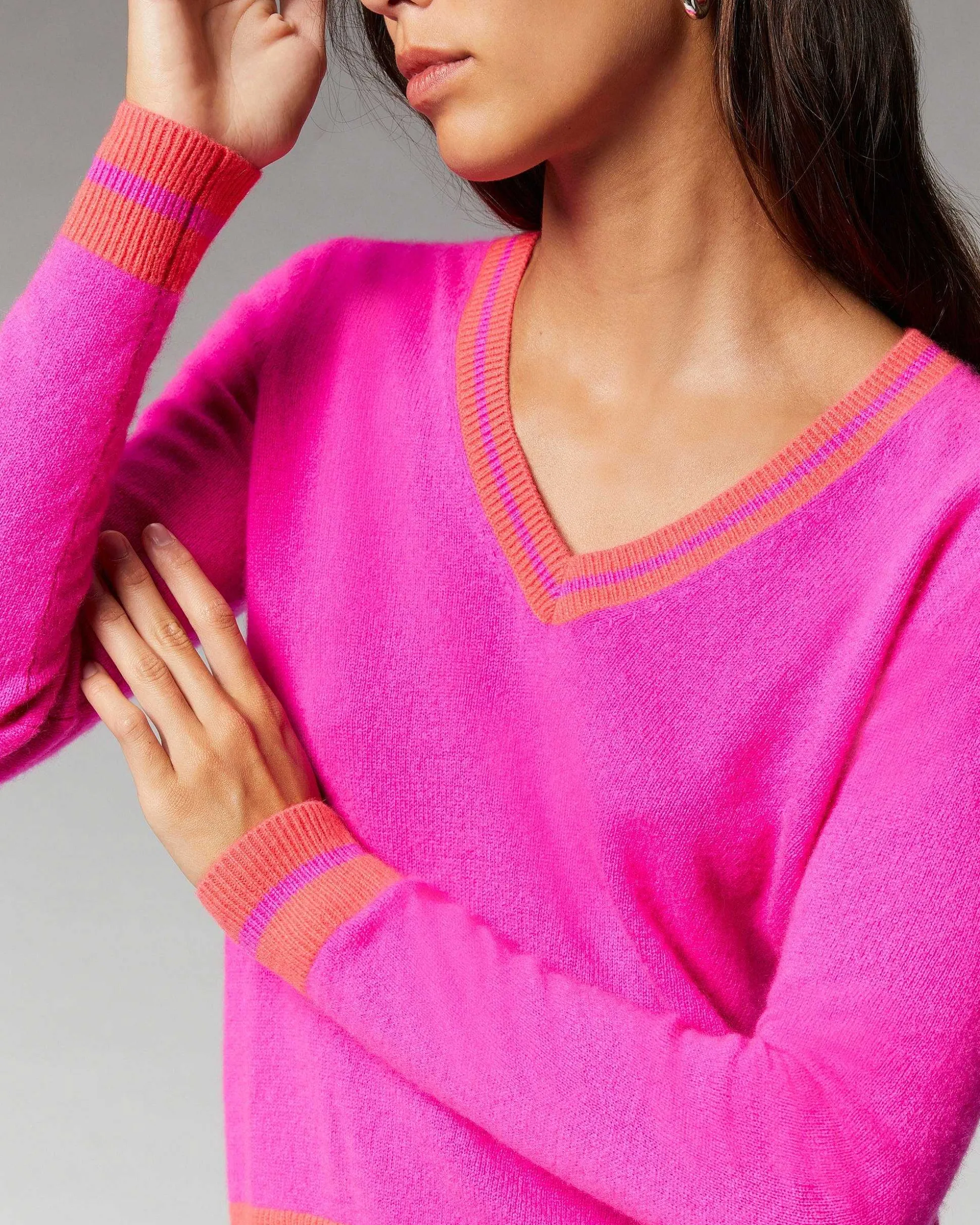 Une Maille Légère Et Infiniment Douce Pour Ce Pull Court Confectionné En Cachemire 2 Fils. Muni De Manches Longues Et D’Un Col V, Il Affiche Des Bords Ornés De Rayures Tennis Aux Couleurs Vibrantes. Révélant Une Allure Futuriste Et Sporty-Chic, Il S’Associe Facilement À Une Jupe Satinée Ou Un Jean Décontracté.