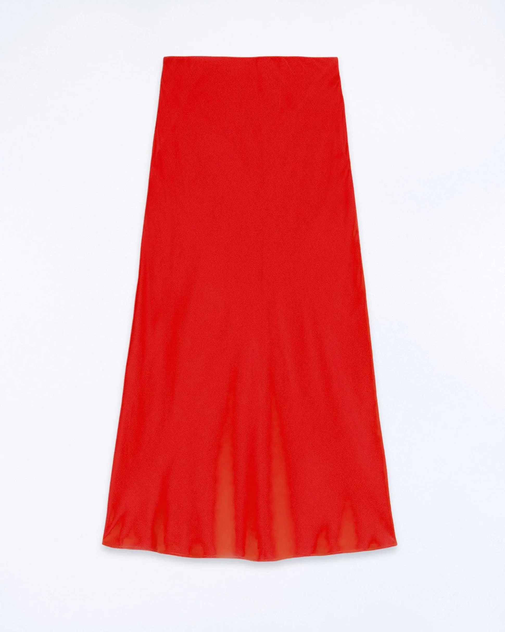 La Jupe Gina Mi-Longue En Satin De Soie Brillant Et Soyeux S’Adopte De Jour Comme De Nuit, Avec Un Caraco Léger Comme Une Maille Moelleuse. D’Une Élégance Cosmique, Elle Dévoile Une Taille Élastiquée Et Un Drapé Fluide Évasé.