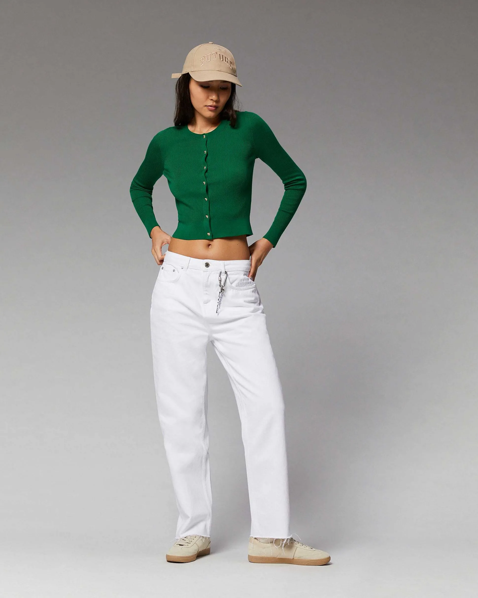 Confectionné En Laine Mérinos Extra Fine Certifiée Rws (Responsible Wool Standard), Ce Pull Cardigan Court Et Ajusté Se Porte Comme Une Seconde Peau. Muni D’Un Col Rond, De Bords Côtelés Et De Manches Longues, Il Se Pare D’Une Fermeture Ponctuée De Boutons Bijoux, Fusionnant L’Élégance Intemporelle Et L’Audace Spatiale.