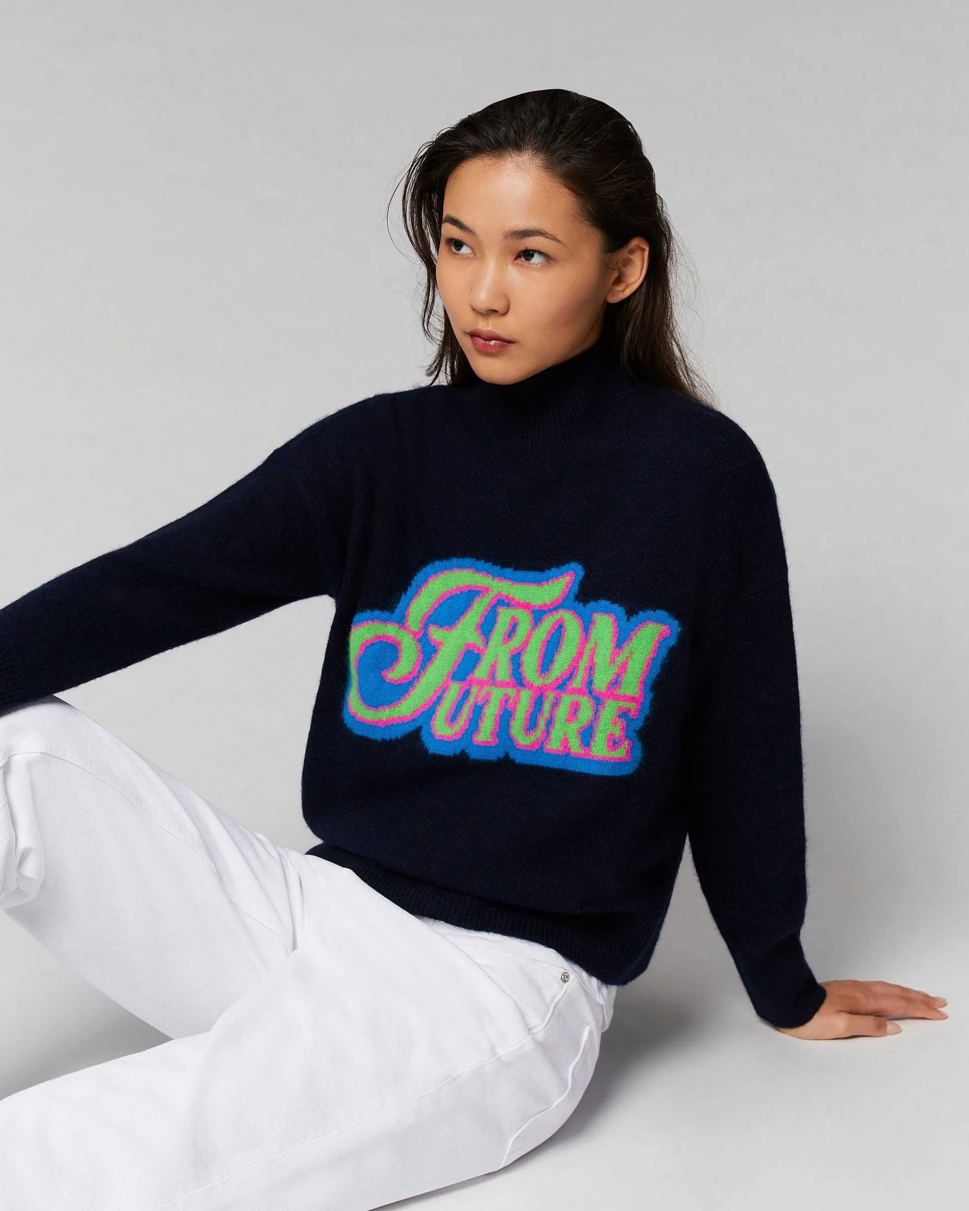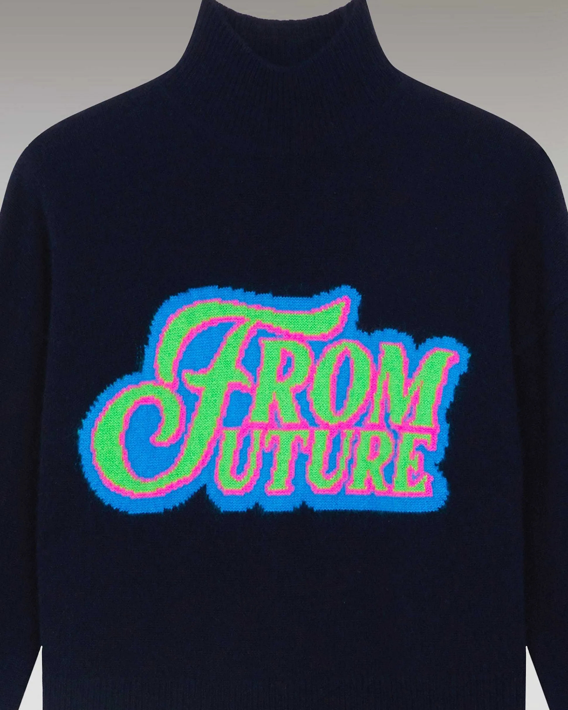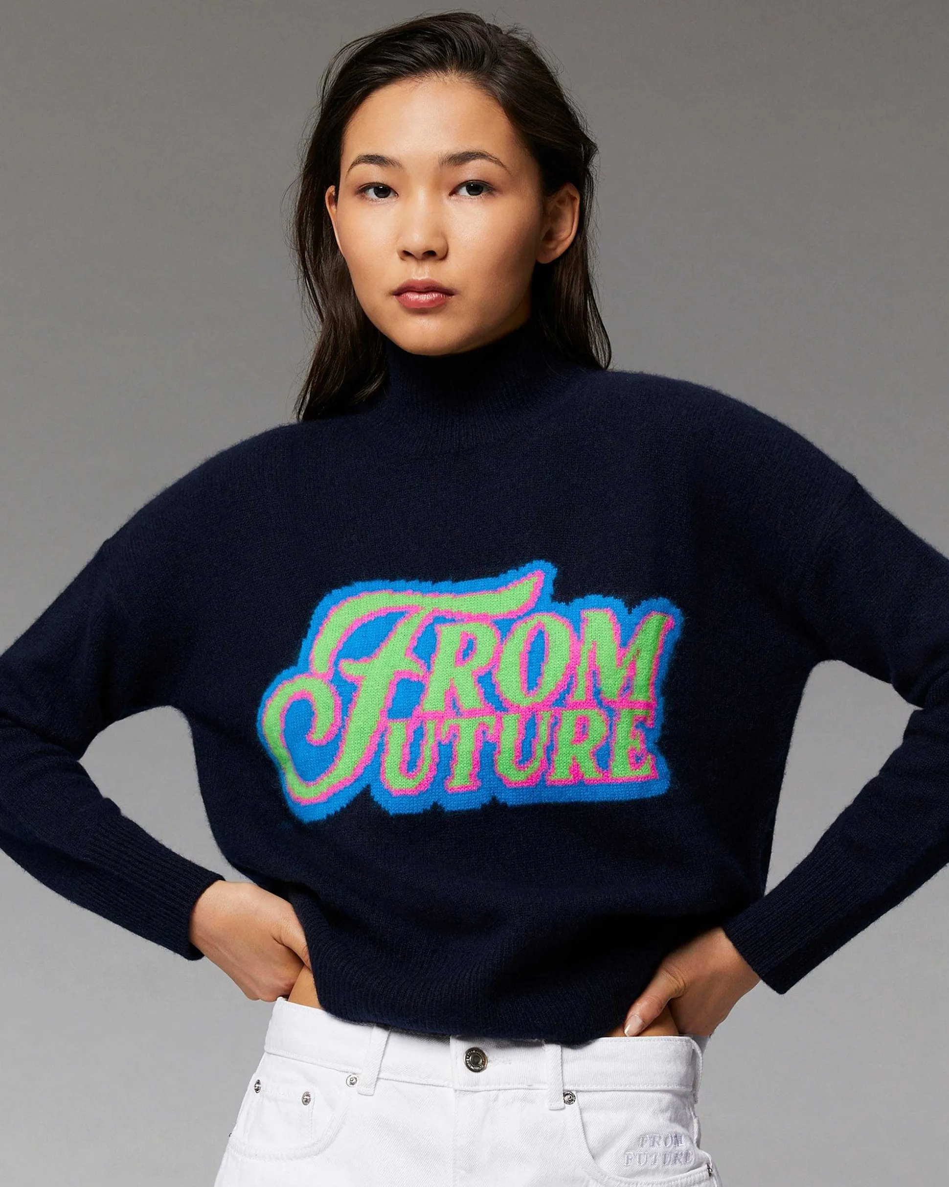 Faites Plonger Votre Allure Vers De Nouveaux Horizons Cosmiques Avec Ce Pull Court Et Oversize. Confectionné En Cachemire 4 Fils, Il Affiche Un Col Montant, Des Manches Longues Et Des Bords Côtelés. Une Signature « From Future » Aux Couleurs Vibrantes Se Dévoile À L’Avant, Vous Invitant À Rejoindre Le Club ! Mêlant Douceur Et Audace, Complétez Votre Look Avec Un Pantalon Droit Et Des Sneakers.