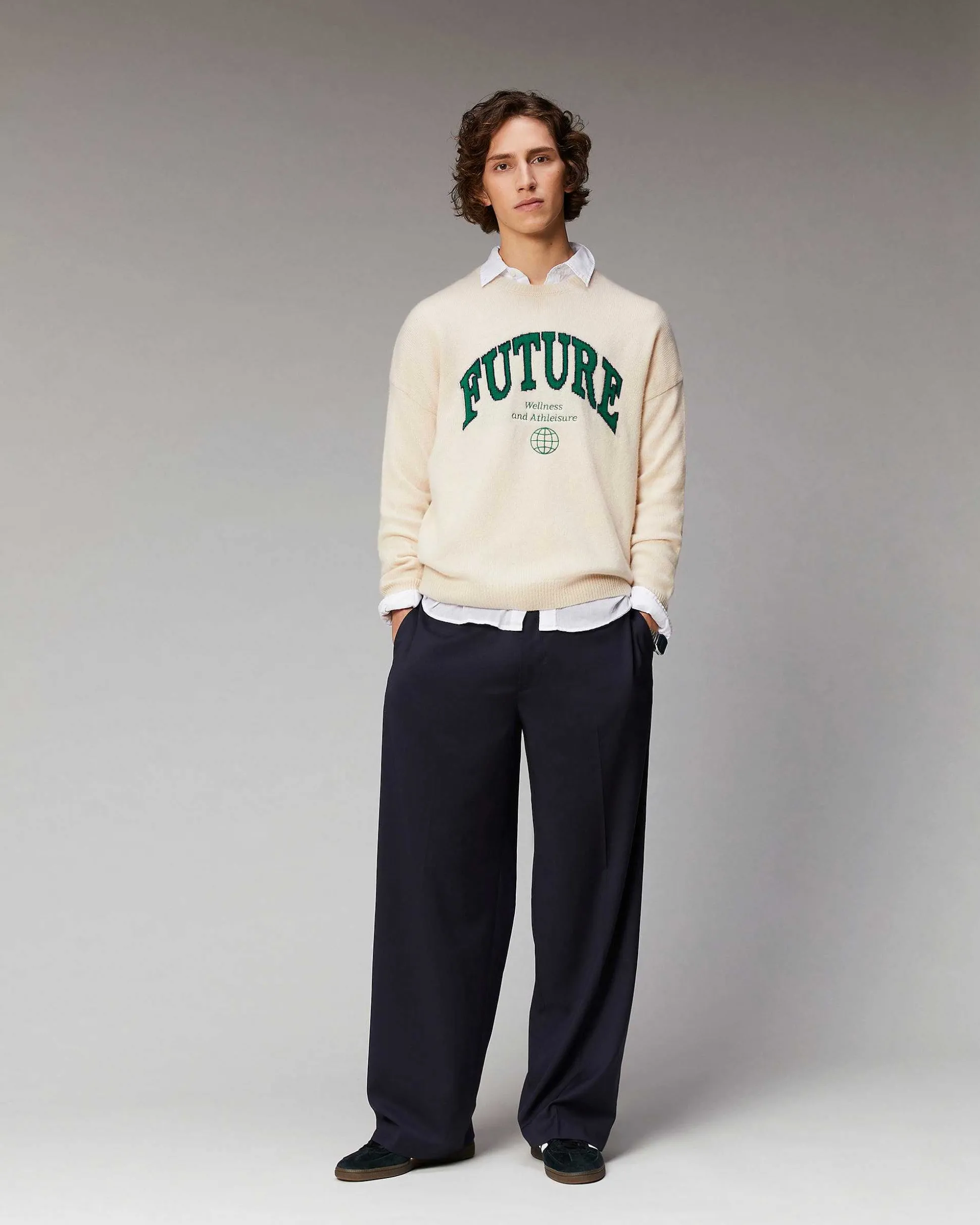 Une Maille Infiniment Douce Se Dévoile Sur Ce Pull Oversize Confectionné En Cachemire 4 Fils. Muni D’Un Col Rond, De Manches Longues Et De Bords Côtelés, Il Arbore Fièrement Une Signature Contrastée « Future » En Jacquard, Vous Invitant À Rejoindre Le Club ! Empruntant Les Codes Du Vestiaire Collège, Il Séduit Par Son Audace Futuriste. Complétez Votre Look Sporty-Chic Avec Une Chemise Et Un Pantalon De Tailleur.