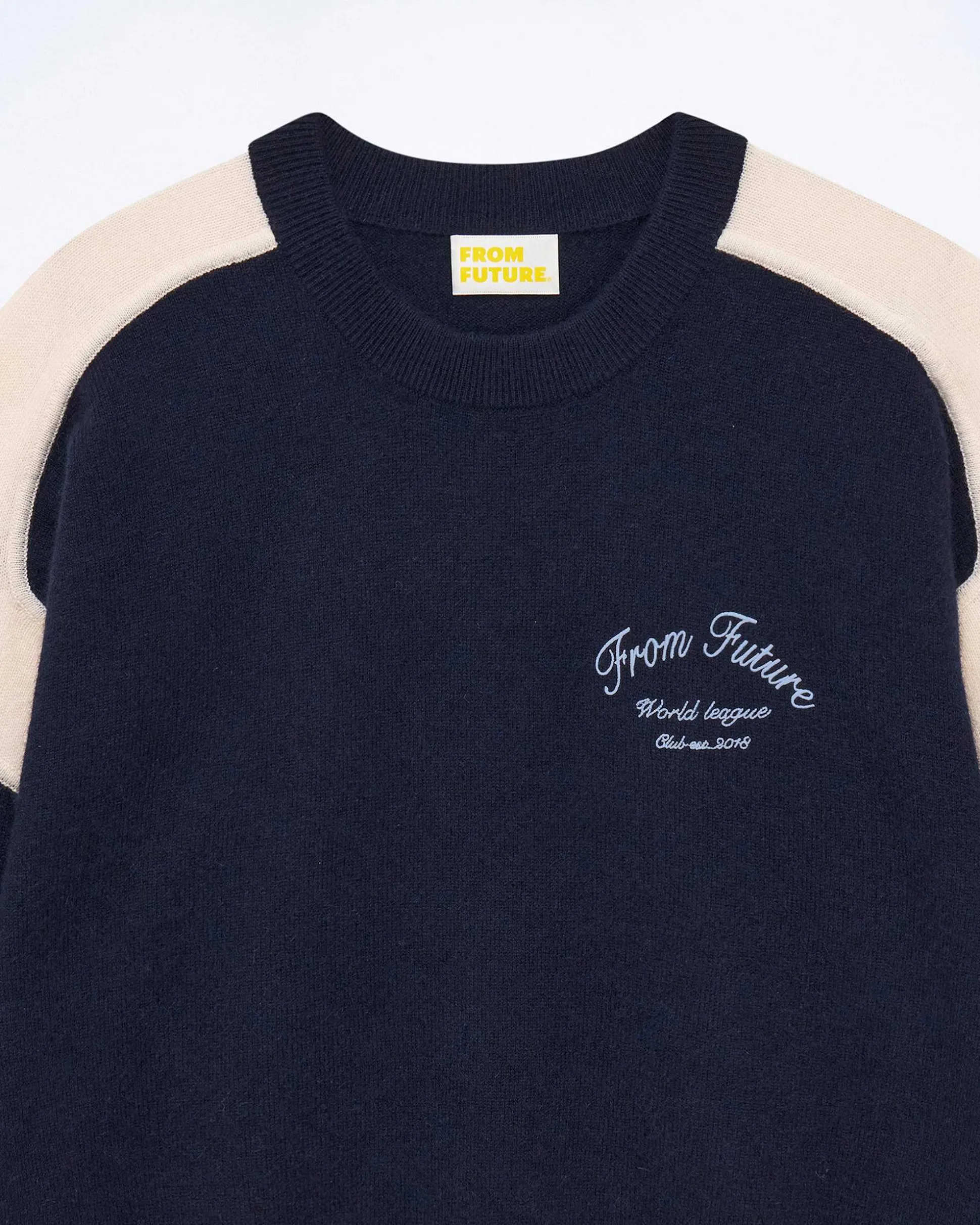 Embarquez Vers Un Futur Cosmique Dans Ce Pull Confectionné En Cachemire 2 Fils. Inspiré Du Style Collège, Il Arbore Une Broderie « From Future Club » Sur La Poitrine Et Des Bandes Contrastées Aux Épaules Pour Structurer Votre Allure. Muni D’Un Col Rond, De Manches Longues Et De Bords Côtelés, Glissez-Le Sur Une Chemise Et Une Jupe Pour Un Look Chic Et Casual.