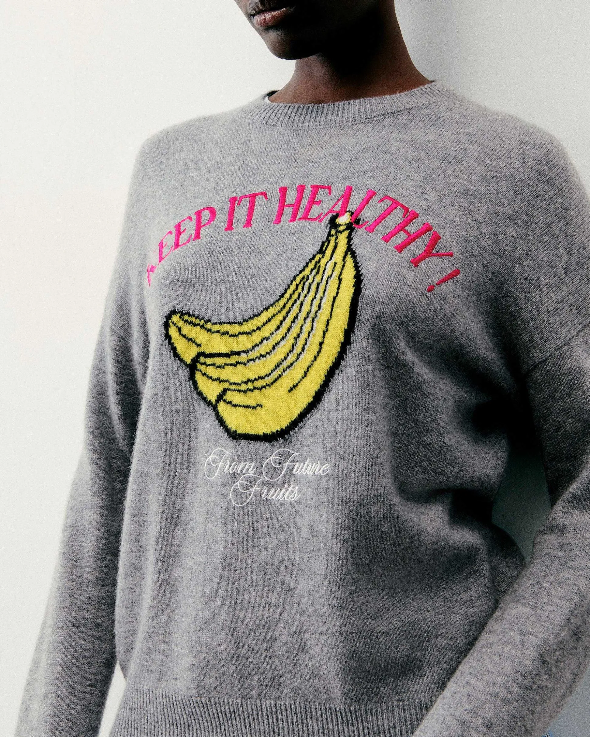 Incarnez L’Audace Futuriste Avec Ce Pull Long Et Oversize, En Cachemire Infiniment Doux. Muni D’Un Col Rond, De Manches Longues Et De Bords Côtelés, Il Arbore Un Motif Banane Contrasté Réhaussé D’Un Message « Keep It Healthy ! ». Chic Et Casual, Mixez-Le À Un Jean Ample Et Une Casquette Signature.